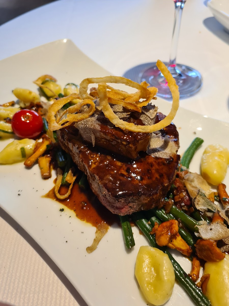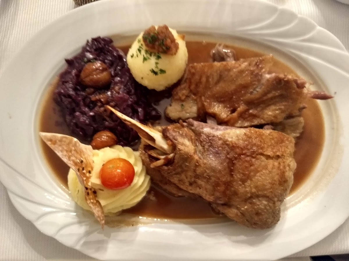 Kühler Krug's menu features a mix of traditional German cuisine and western classics, perfect for every palate. Among the signature dishes, the Tournedo Rossini stands out as a true indulgence. This French-inspired dish of tender beef topped with foie gras and a rich sauce is a must-try for those craving a luxurious dining experience. For a heartier option, the Gänsebraten (roast goose) is expertly prepared, delivering a crispy skin and juicy meat that perfectly embodies the comforting flavors of German cuisine.