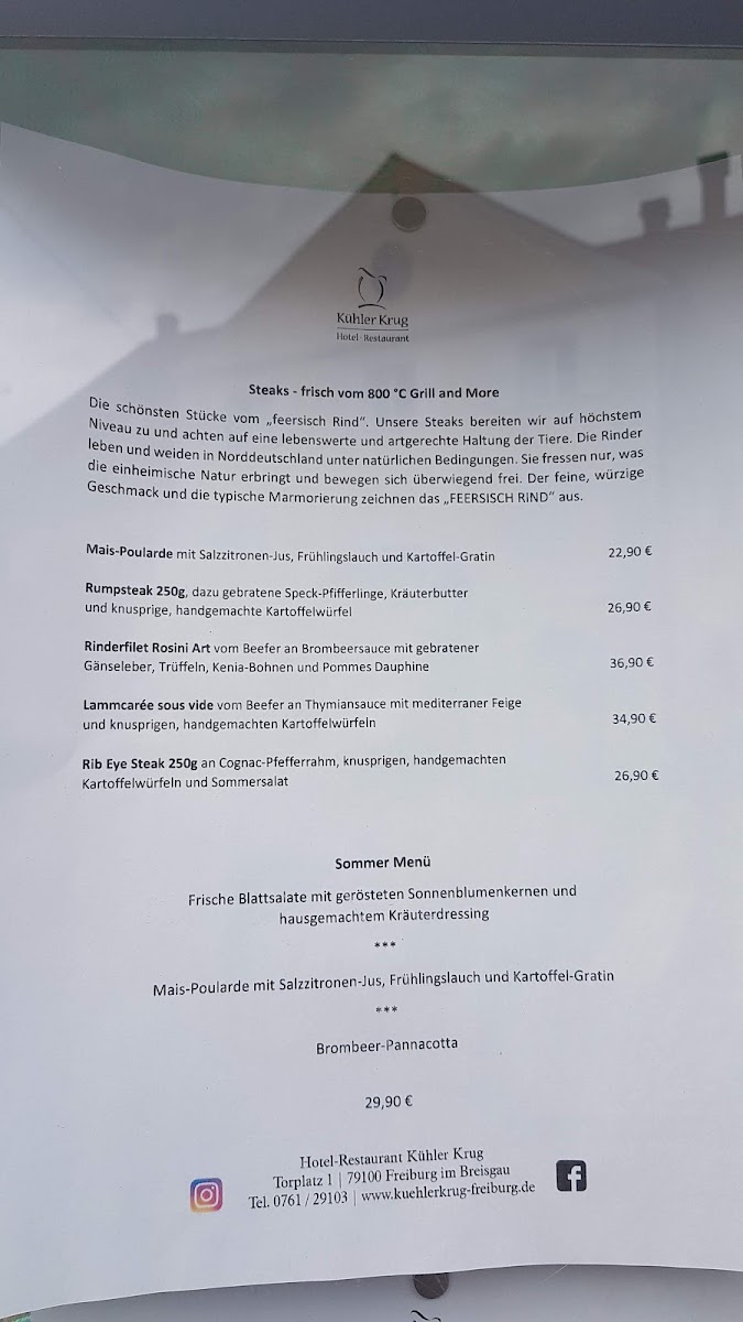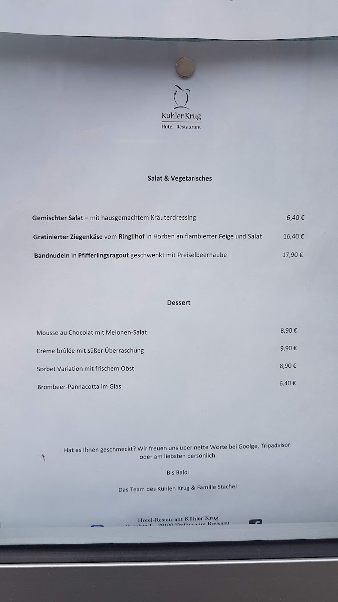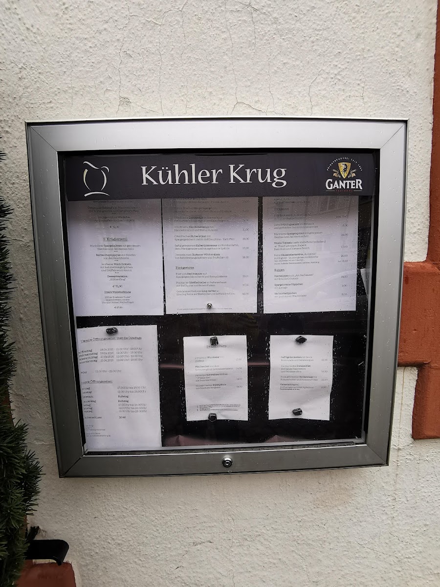 The menu at Kühler Krug offers a delightful selection of hearty, traditional German dishes that capture the essence of comfort and rustic charm. For starters, the Salad provides a fresh and light introduction, setting the stage for the more substantial offerings. A standout dish is the Tournedo Rossini, a luxurious steak topped with foie gras and served with a rich sauce, making it a must-try for those craving indulgence. The Gänsebraten, or roast goose, is another highlight, perfectly roasted and paired with classic sides. For a taste of home-style German cooking, the Hausgemachte Roulade offers a comforting experience, while the Roastbeef Mit Remoulade Und Brägele delivers a delightful balance of flavors with tender beef, tangy remoulade, and crispy potatoes. The Kleiner Feldsalat brings a touch of freshness, ideal for those looking for something lighter to accompany their main courses. As a sweet finale, the Kaiserschmarrn is a fluffy, caramelized pancake dish that will leave anyone craving more. Finally, the Zander Mit Frischen Pfifferlingen brings a touch of elegance, featuring fresh pike-perch with savory chanterelle mushrooms. Kühler Krug’s menu offers a mix of refined, comforting, and satisfying dishes that make it a great destination for those seeking an authentic taste of German cuisine.